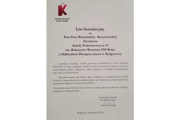 Dnia 4 listopada 2025 r. odbyła się uroczystość wręczenia listów gratulacyjnych przez Kujawsko-Pomorskiego Kuratora Oświaty dyrektorom 30 szkół podstawowych województwa kujawsko-pomorskiego, których uczniowie osiągnęli najwyższe wyniki na egzaminie ósmoklasisty. Wśród wyróżnionych placówek zalazła się także Szkoła Podstawowa nr 17. W imieniu całej naszej społeczności wyróżnienie odebrała Pani dyrektor Ewa Brożyńska-Kozanowska.