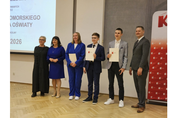 Z radością informujemy o sukcesach naszych uczniów w konkursach przedmiotowych. W bieżącym roku szkolnym osiągnęli oni znakomite wyniki na szczeblu wojewódzkim. Uczeń klasy 8a Marcin Karczmarek zdobył tytuł laureata z chemii, a także uzyskał tytuły finalisty z biologii, geografii oraz matematyki, co świadczy o jego szerokiej wiedzy i dużym zaangażowaniu w naukę. Uczeń klasy 8a Jan Goiński odniósł imponujący sukces, zdobywając tytuł laureata aż z czterech przedmiotów: języka angielskiego, informatyki, chemii oraz fizyki, a także uzyskał tytuł finalisty z matematyki. To wyjątkowe osiągnięcie potwierdza jego wszechstronne uzdolnienia i wysoki poziom kompetencji. Uroczyste wręczenie zaświadczeń i nagród odbyło się w dniu 20.04 podczas Gali Laureatów Konkursów Przedmiotowych w Auditorium Novum Politechniki Bydgoskiej im. Jana i Jędrzeja Śniadeckich. W wydarzeniu uczestniczyli wyróżnieni uczniowie wraz dyrektorem, nauczycielami i opiekunami.