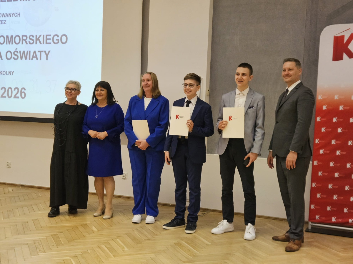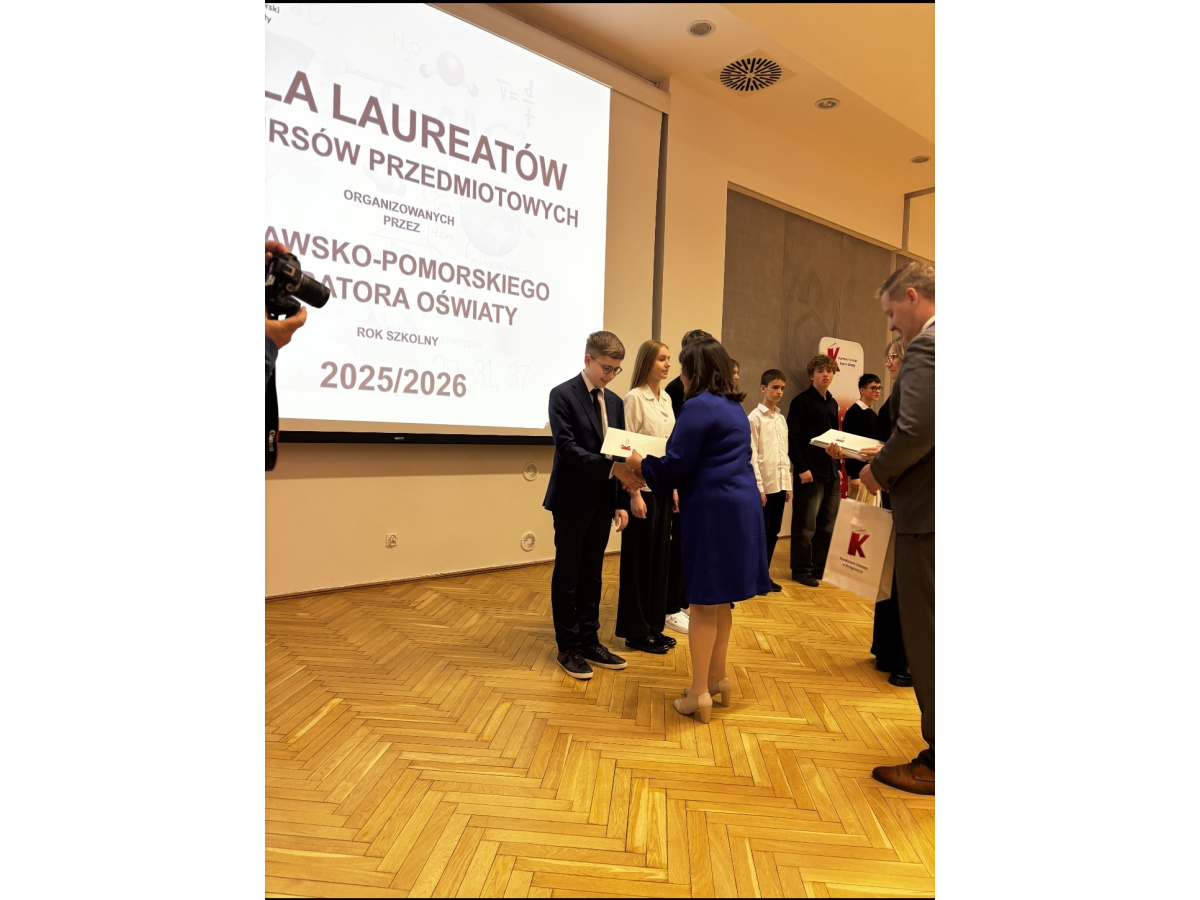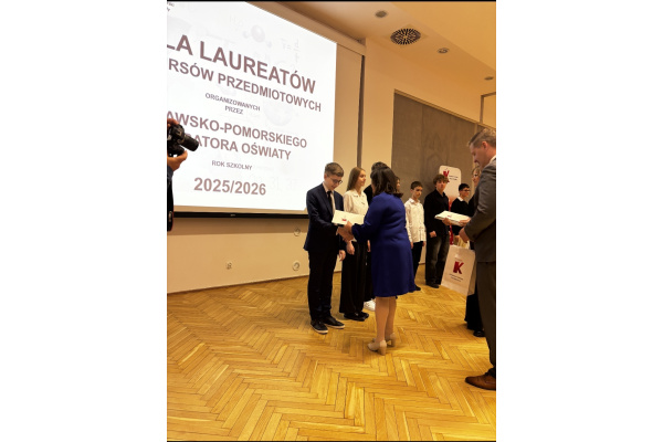 Pani dyrektor odebrała wyróżnienie przyznane placówce za wysokie osiągniecia uczniów, natomiast Jan Goiński został dodatkowo uhonorowany za uzyskanie czterech tytułów laureata i jednego finalisty. Serdecznie gratulujemy wszystkim nagrodzonym uczniom i nauczycielom. Życzymy dalszych sukcesów i rozwijania pasji!